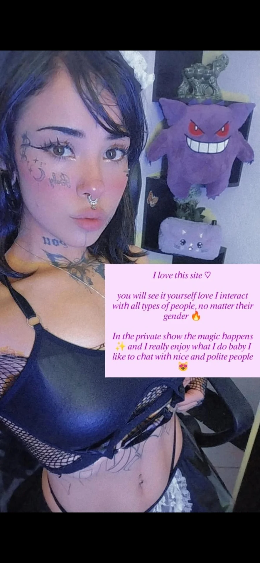 I have real tattoos on my face, I'm very funny and sexually active... Singer in the making, I like to have fun and I am a Scorpio, I am 20 years old and I study 💖 I want to play with your dick baby
